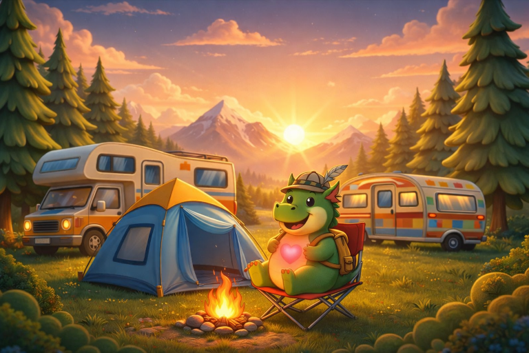 Willkommen auf dem Campingplatz – dem Zuhause von Flämmchen, dem kleinen grünen Drachen!